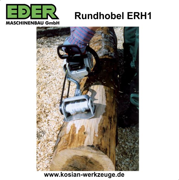 Der EDER Rundhobel ERH1 eignet sich zum Hobeln von runden Holzoberflächen bis zu einem Durchmesser von 30 cm. Die konstruktive Ausbildung der Hobelwalze mit ihren schräg stehenden Messern bewirkt eine hohe Zerspanungsleistung bei minimalem Kraftaufwand. Der Hobelkopf wird auf das um die Drehachse der Walze pendelnd gelagerte, gewölbte Führungsblech aufgesetzt. Die auf der Hobelwalze befestigten Messer sind stufenlos einstellbar, wodurch eine Spandicke bis zu einer Stärke von 1 mm erreicht werden kann.