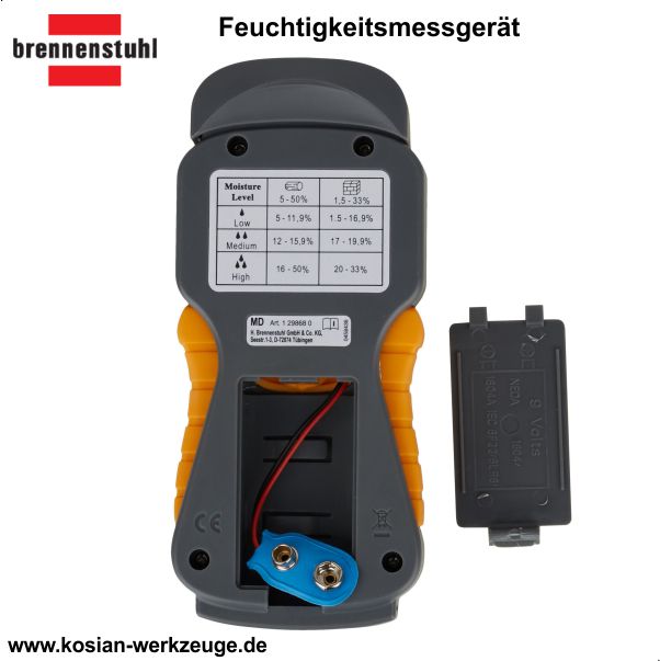 Der Feuchtigkeits-Detektor MD von Brennenstuhl überzeugt durch die Qualität und Sicherheit in allen Bereichen. Es ermöglicht eine schnelle und einfache Bestimmung der Feuchtigkeit an den Oberflächen verschiedener Materialien und kann dank der „Hold“-Funktion auch an schlecht zugänglichen Stellen genutzt werden. Das Messgerät schaltet sich 3 Minuten nach dem letzten Gebrauch automatisch ab und überzeugt außerdem durch folgende Eigenschaften:* Anzeige über großes LCD-Display (in Prozent, Auflösung 0,1%) sowie akustisch (abschaltbar)* Messbereich von 5 - 50% für Holz, bei Baustoffen 1,5 - 33%* Mit separatem Batteriefach für 9V Block* Inklusive Batterie-Unterspannungsanzeige* Mit Schutzkappe